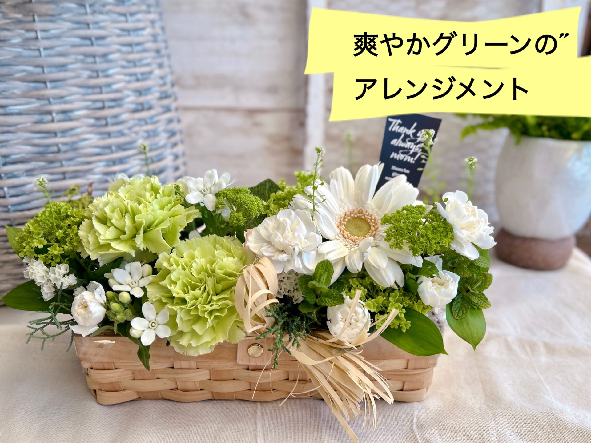 爽やかグリーンの横長アレンジメント